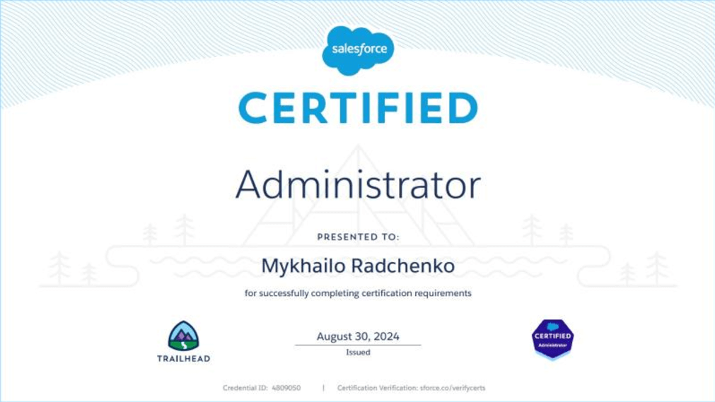 This is the foundational certification that shows an admin has the basic skills needed to manage and configure a Salesforce environment. By the way, Mykhailo is not only a Certified Salesforce Administrator but also an author on our website. You may check his articles here.